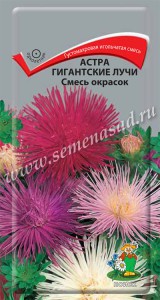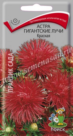Однолетник. Густомахровая игольчатая астра. Сочетание изящества и впечатляющего размера – новая серия астр «Гигантские лучи». Соцветия крупные (12 см), махровые, очень изящные,собраны из скрученных в трубочки ярких лепестков. Одно растение дает до 14 цветоносов. Цветение раннее, обильное и продолжительное. Форма, размер и качество цветов прекрасно подходят для срезки. Растение светолюбивое, холодостойкое (может выносить заморозки до -3-4 °С). Предпочитает рыхлые питательные почвы. В засушливый период нуждается в поливе. Уход обычный – прополки, аккуратное рыхление, 2-3 подкормки минеральными удобрениями. Семена сеют в конце марта-начале апреля. Всходы появляются на 7-14 день. При появлении первого настоящего листа сеянцы пикируют. Если подсемядольное колено у сеянцев сильно вытянулось, то при пикировке их можно заглубить почти до семядольных листочков. В открытый грунт рассаду можно высаживать с середины мая. Возможен подзимний посев в грунт. В озеленении астры применяются очень